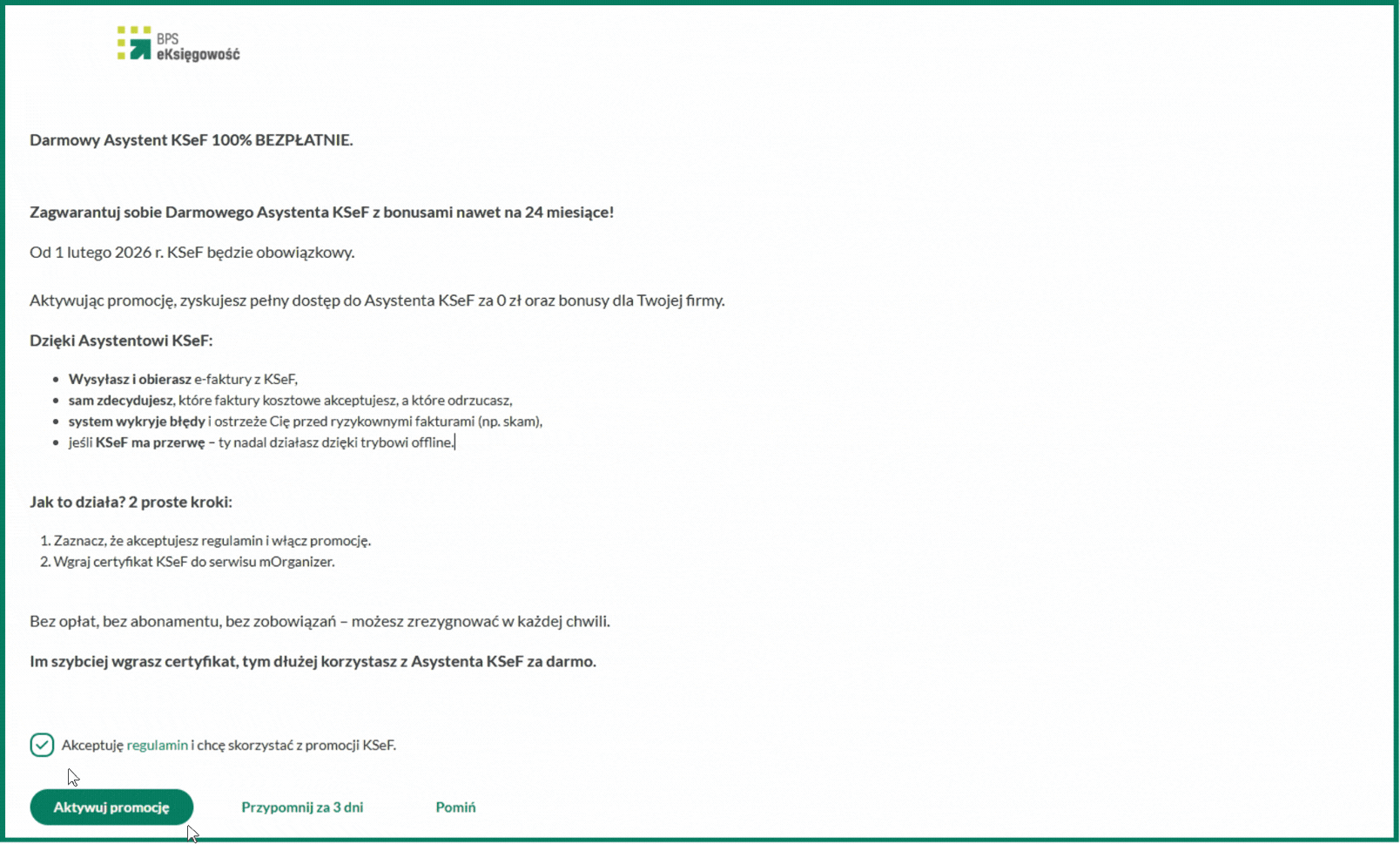 Po zalogowaniu się do systemu zapoznaj się z wyświetlonym komunikatem, zaakceptuj regulamin i kliknij Aktywuj promocję.