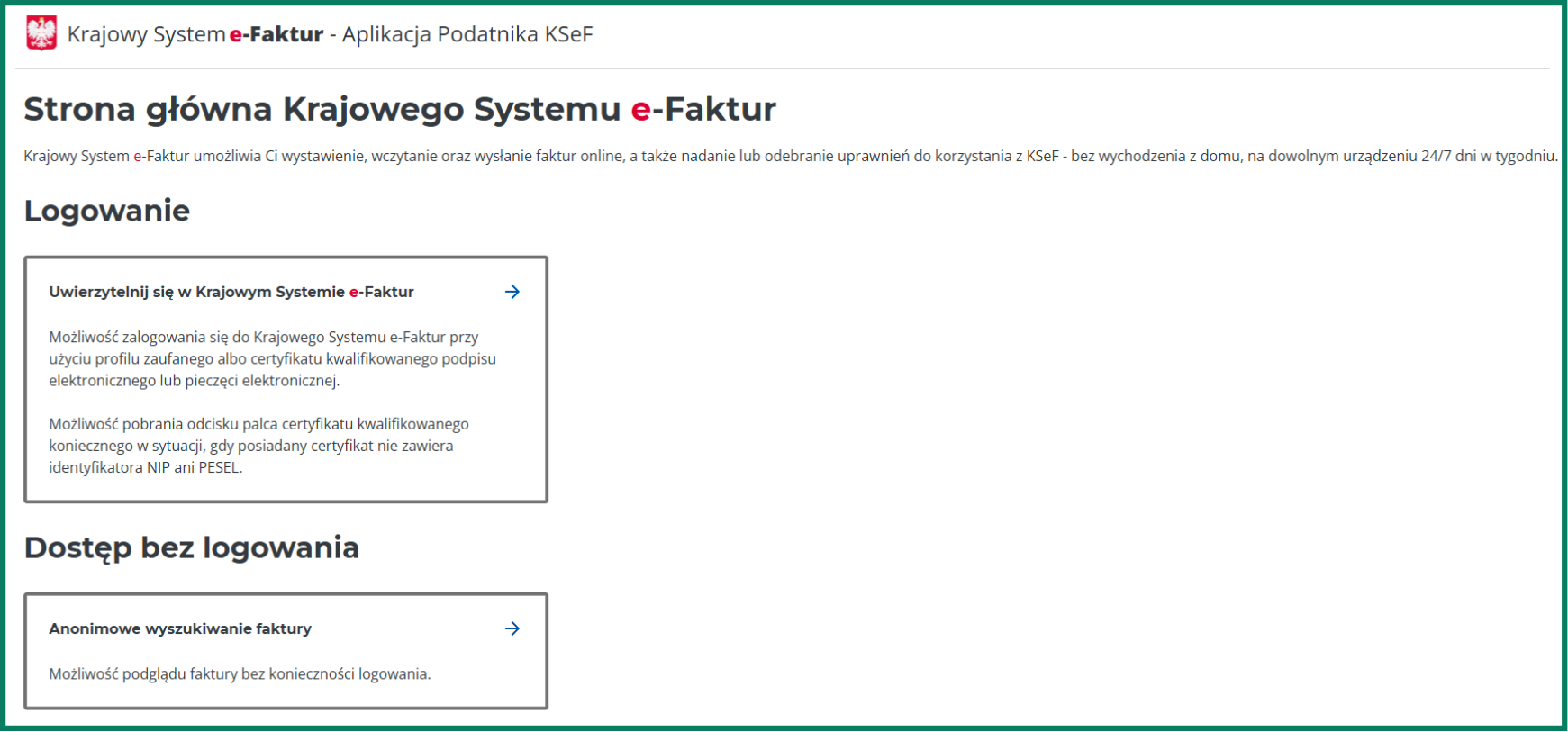 Wybierz opcję Przejdź do platformy KSeF w celu przejścia do Aplikacji Podatnika KSeF 2.0.