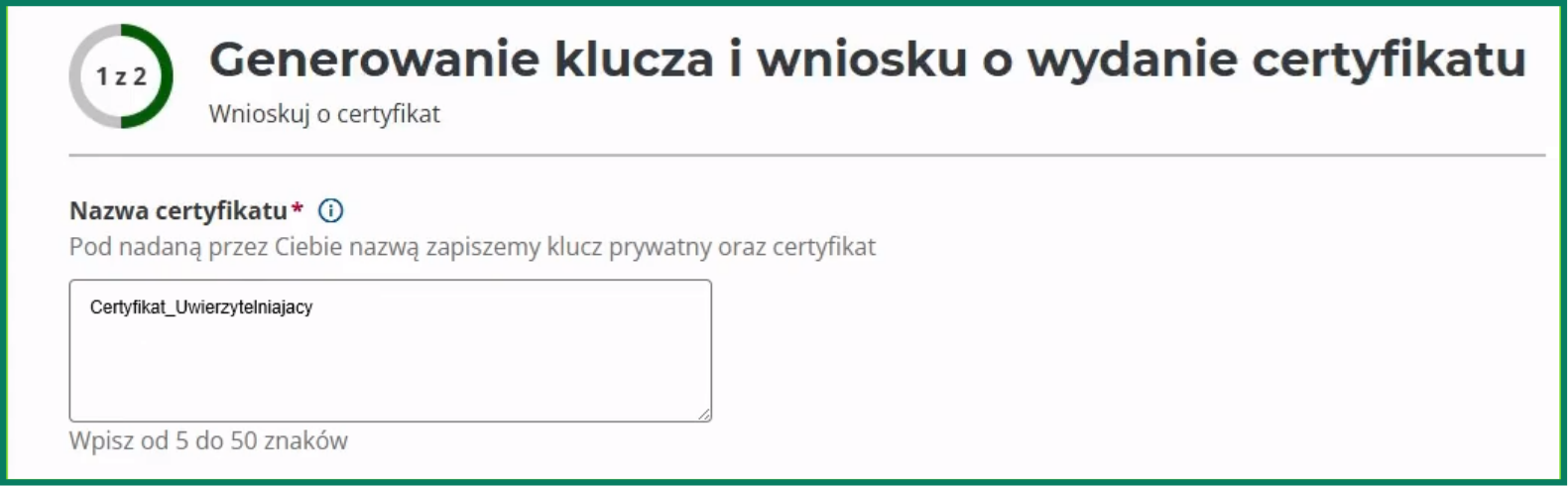 Na ekranie Generowanie klucza i wniosku o wydanie certyfikatu system wygeneruje dla Ciebie parę kluczy: