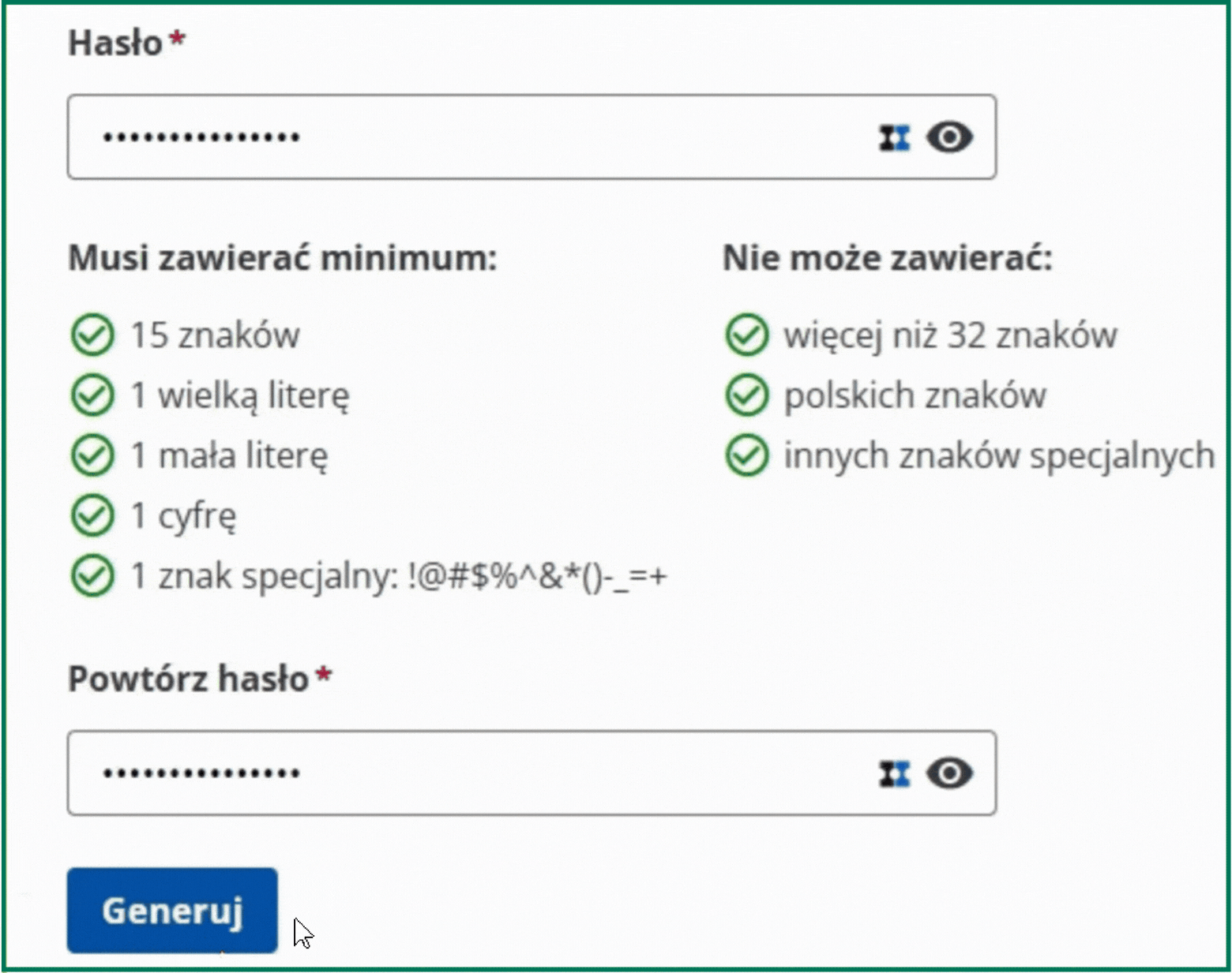 W polu Powtórz hasło wpisz hasło ponownie. Po uzupełnieniu kliknij Generuj — system wygeneruje parę kluczy.