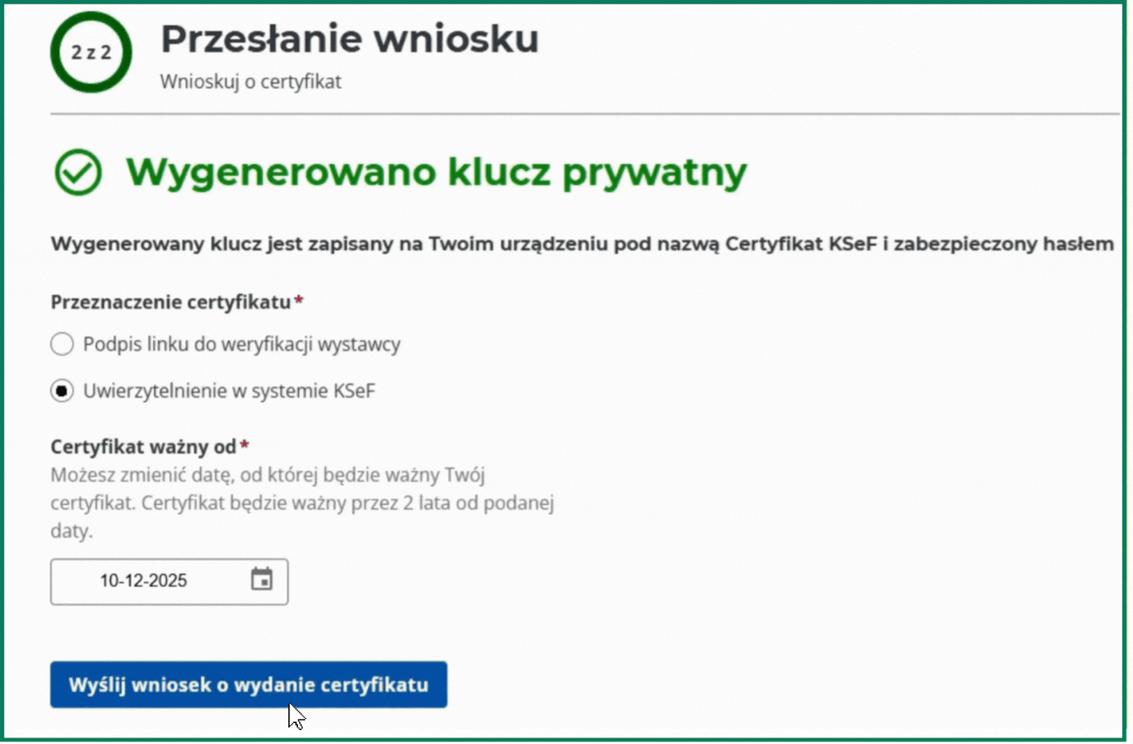 Klucz prywatny zostanie automatycznie zapisany na Twoim urządzeniu jako plik z rozszerzeniem .key (np. certyfikat_uwierzytelniajacy.key).