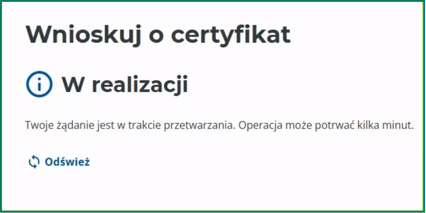 Po wypełnieniu kliknij Wyślij wniosek o wydanie certyfikatu — uruchomi to proces wydawania certyfikatu KSeF. Proces może potrwać kilka minut. Możesz użyć przycisku Odśwież, aby sprawdzić status.