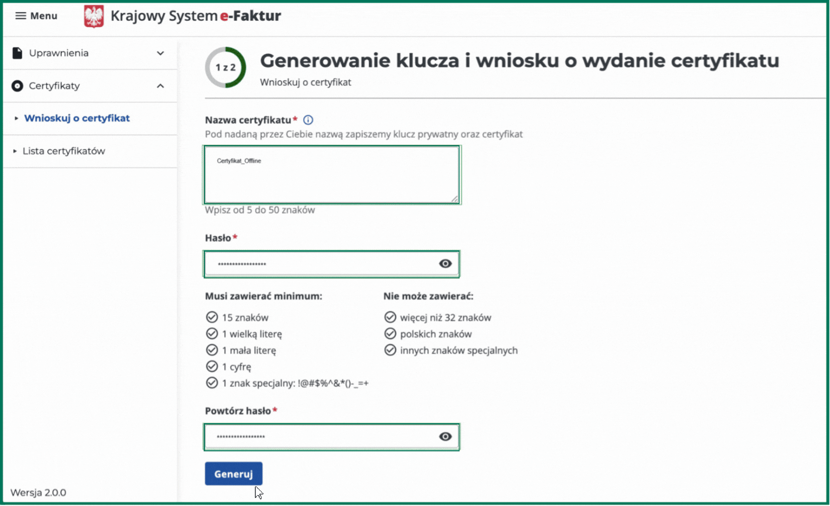 Wypełnij dane certyfikatu. Wymagane jest wprowadzenie Nazwy certyfikatu oraz utworzenie Hasła, które będzie zabezpieczać klucz prywatny oraz Powtórz hasło. Wybierz opcję Generuj. Klucz prywatny zostanie automatycznie zapisany na Twoim urządzeniu jako plik z rozszerzeniem .key.