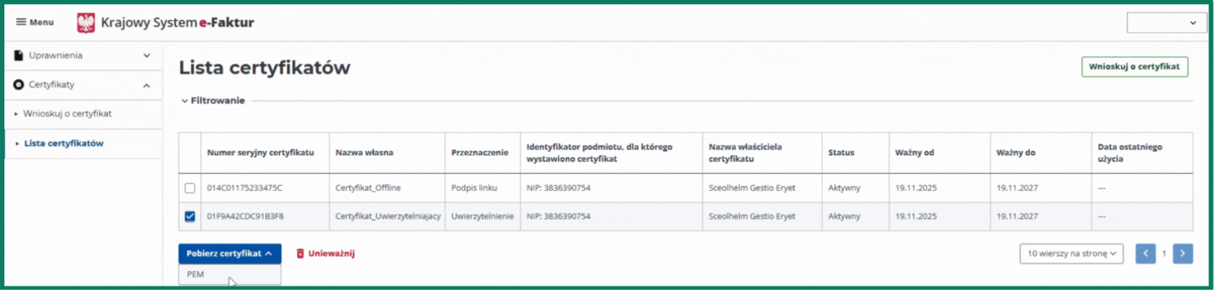 Certyfikaty można pobierać tylko, gdy mają status Aktywny (wydany i ważny). Zaznacz checkbox przy certyfikacie (możesz pobrać 1 – 10 certyfikatów jednocześnie). Przy większej liczbie użyj filtrów, aby zawęzić listę. Po zaznaczeniu co najmniej jednego certyfikatu przycisk Pobierz certyfikat stanie się aktywny - wybierz format PEM.