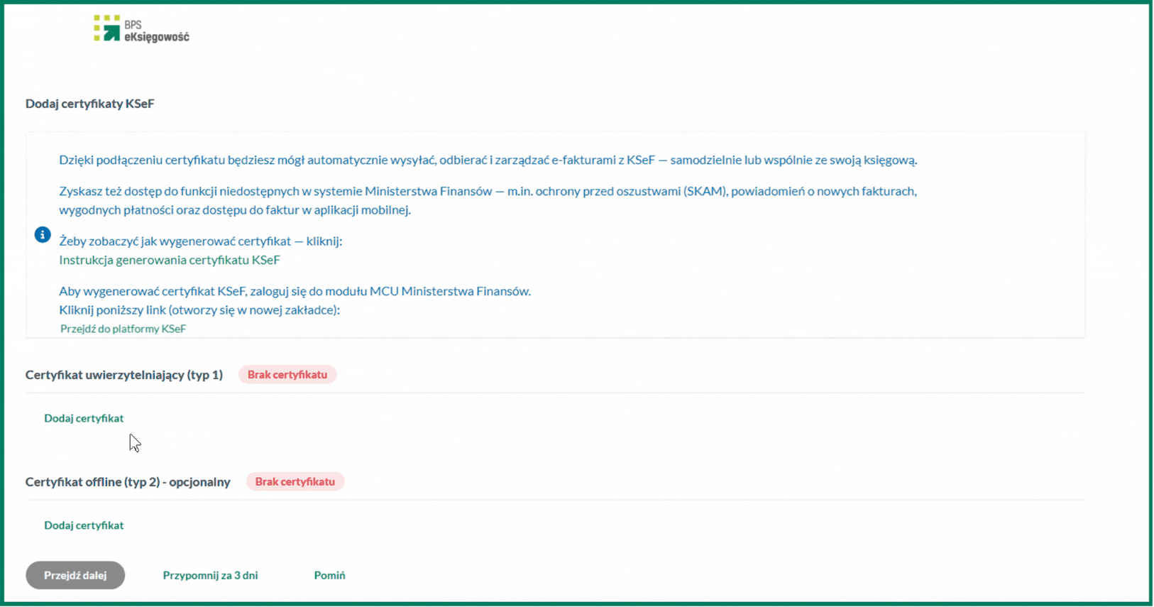 Na koniec wybierz opcję Przejdź dalej. Gotowe. System BPS eKsięgowość jest już połączony z KSeF.