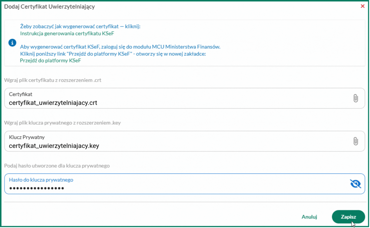 Wgraj certyfikat w formacie .crt, który został wygenerowany w Aplikacji Podatnika KSeF 2.0 z przeznaczeniem certyfikatu do Uwierzytelnienia w systemie KSeF. Załącz klucz prywatny w formacie .key. Wprowadź również Hasło do klucza prywatnego, które zostało zdefiniowane podczas generowania certyfikatu oraz zapisz zmiany.