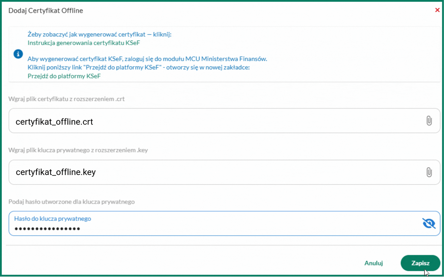 W sekcji Certyfikat offline (Typ 2) - opcjonalny wybierz opcję Dodaj certyfikat. Wgraj certyfikat w formacie .crt, który został wygenerowany z przeznaczeniem do Podpisu link do weryfikacji wystawcy. Załącz klucz prywatny w formacie .key.