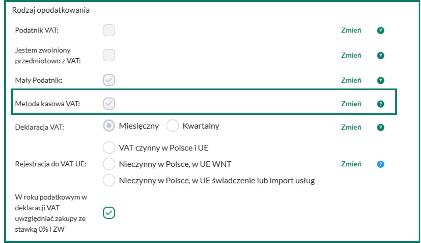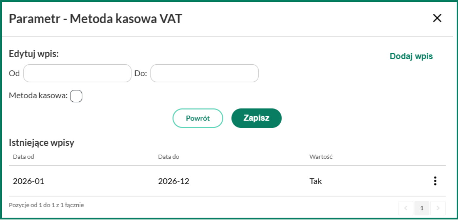 Kliknij Zmień, ustaw właściwy zakres dat, zaznacz metodę kasową i kliknij Zapisz. Twój wpis zostanie dodany i wyświetli się poniżej, w sekcji Istniejące wpisy.