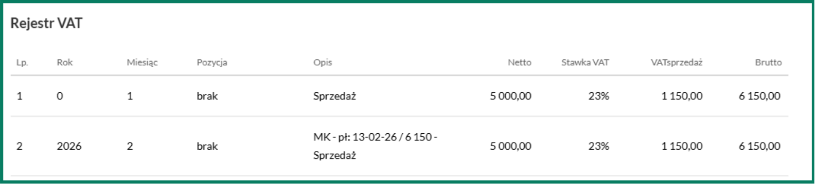 Po dodaniu płatności i uruchomieniu procesu kontroli miesiąca zostanie utworzony wpis do rejestru VAT odpowiadający dacie dokonania zapłaty. Na podglądzie dokumentu znajdzie się informacja o metodzie kasowej (MK), dacie płatności (data w formacie dd-mm-rr) oraz jej kwocie.