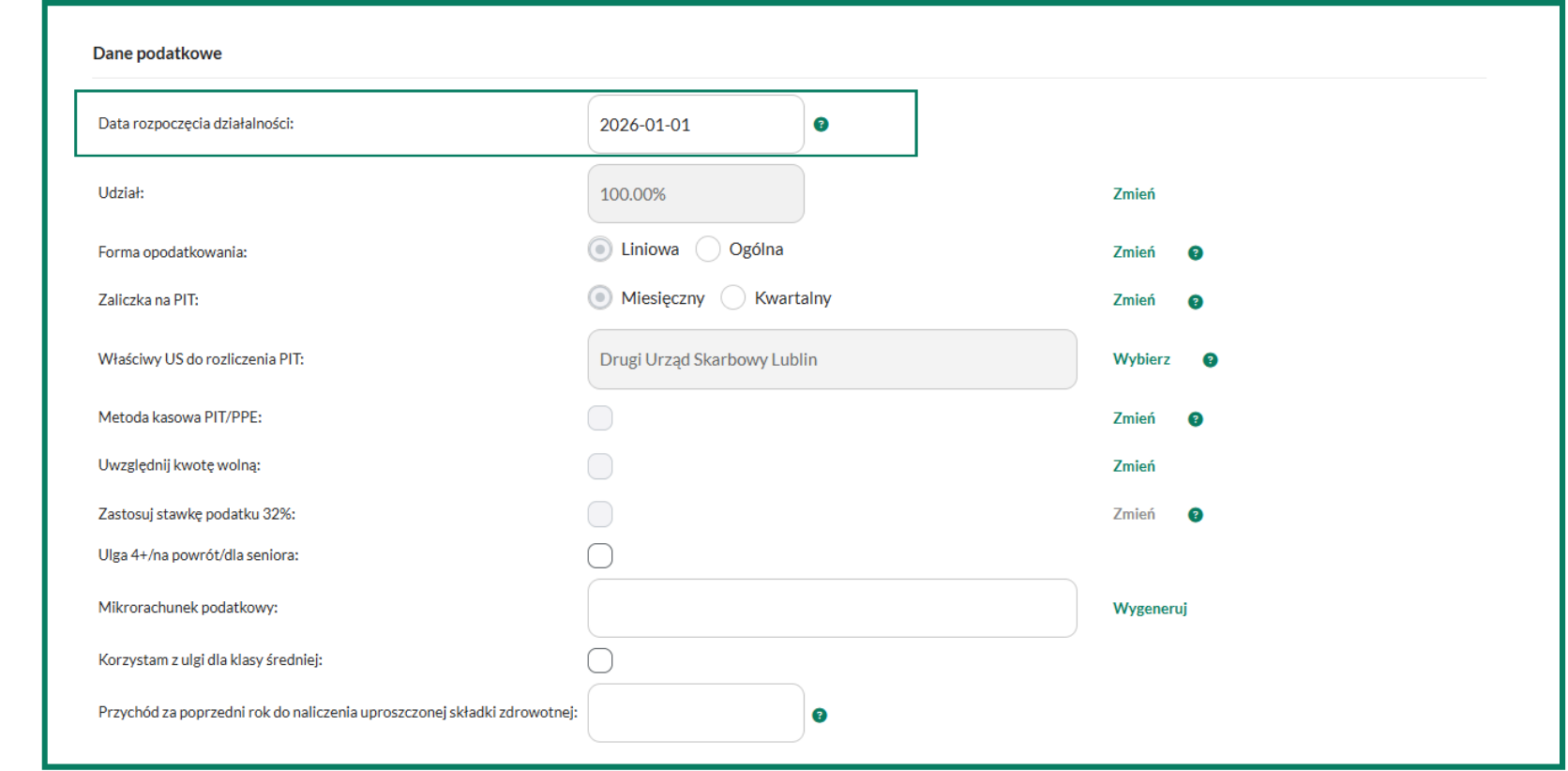 Jeśli działalność została założona innego dnia niż pierwszy dzień miesiąca, system wygeneruje wyliczoną proporcjonalnie składkę społeczną za pierwszy miesiąc. Parametr Data rozpoczęcia działalności przez właściciela, który decyduje o wysokości pierwszej składki, uzupełniany jest w Ustawienia/Właściciel w sekcji Dane podatkowe.