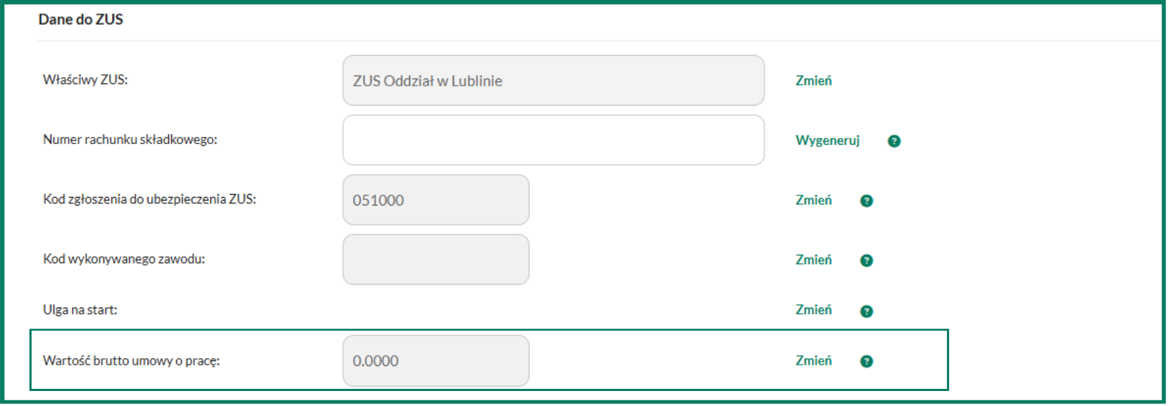 Jeśli opłacana jest jedynie składka zdrowotna powinno się uzupełnić kwotę dla parametru Wartość brutto umowy o pracę. Należy podać wartość brutto umowy o pracę. Kwota ta musi być równa lub wyższa minimalnemu wynagrodzeniu.