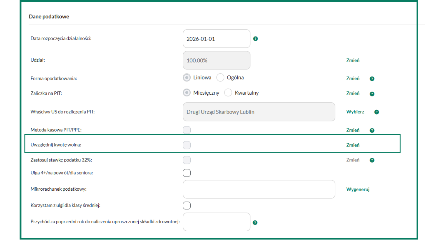 Kwota wolna może być rozliczona przy wyliczeniu zaliczki na zasadach ogólnych lub odjęta bezpośrednio od deklaracji rocznej. W celu odliczenia kwoty wolnej bezpośrednio w zaliczkach, należy przejść do zakładki Ustawienia/ Właściciel i przy parametrze Uwzględnij kwotę wolną należy wybrać przycisk Zmień.
