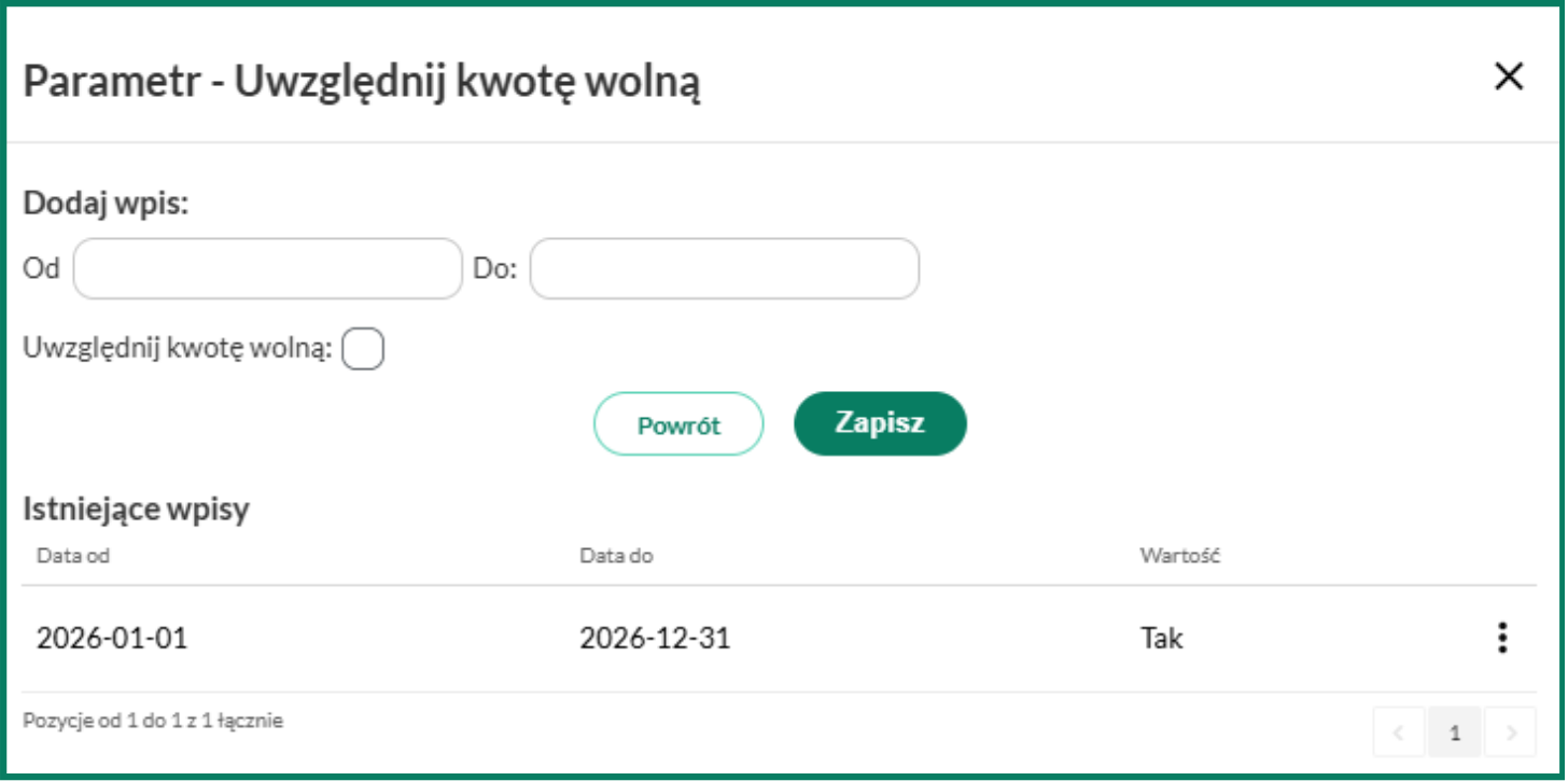 Następnie należy wprowadzić zakres dat - Data od to pierwszy dzień miesiąca, w którym chcemy uwzględnić kwotę wolną w wyliczeniu zaliczki, Data do- data do kiedy chcemy, aby kwota ta była od zaliczki odejmowana lub odległa data w przyszłości (np. 2030-12-31) - parametr ten może zostać w dowolnym czasie edytowany.