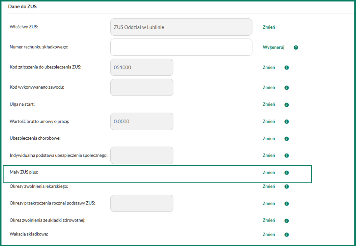 W celu ustawienia małego ZUSu plus należy przejść do zakładki Ustawienia/Właściciel i przy parametrze Mały ZUS wybrać przycisk Zmień.