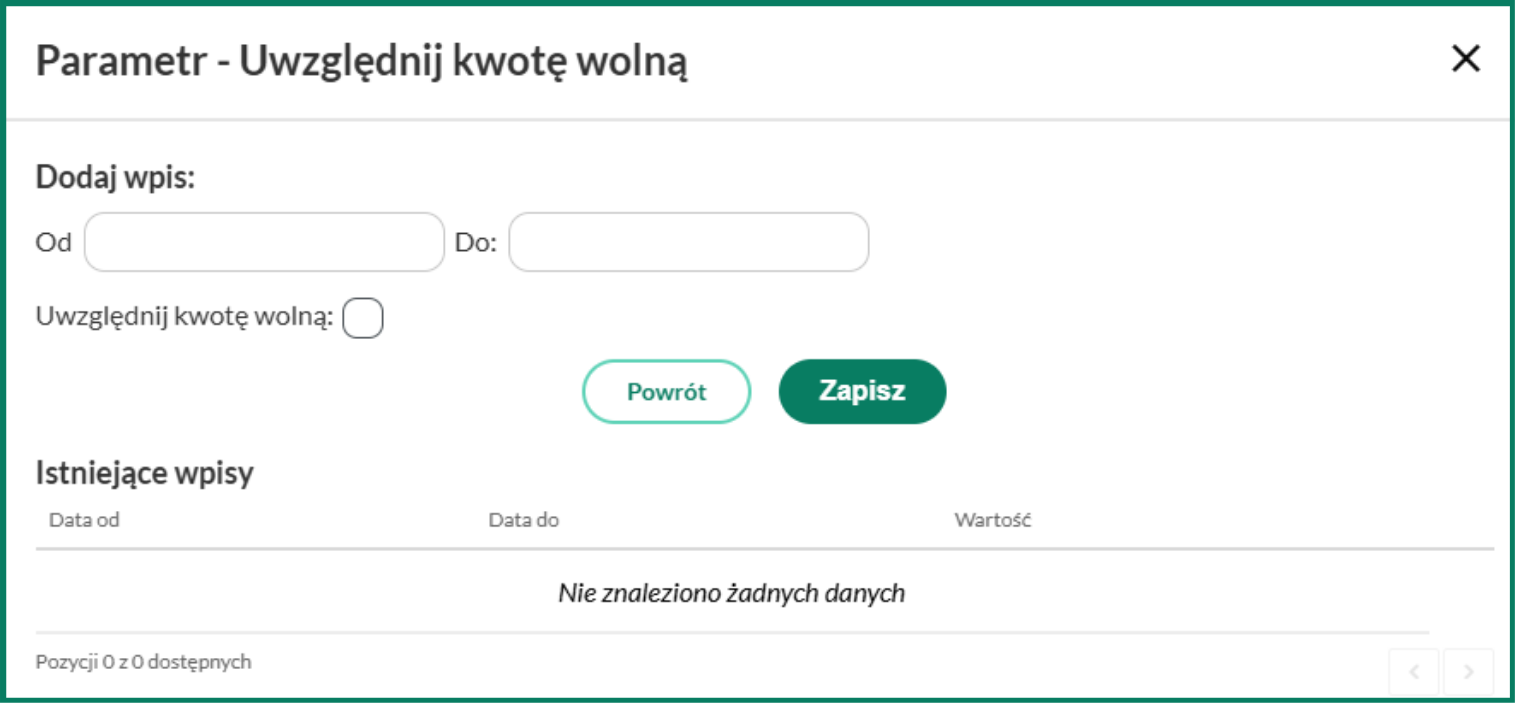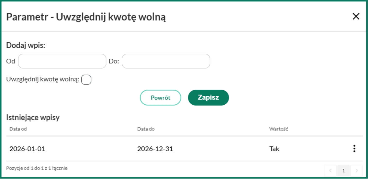 Data od to pierwszy dzień miesiąca, w którym chcemy uwzględnić kwotę wolną w wyliczeniu zaliczki, z kolei Data do oznacza datę do kiedy chcemy, aby kwota wolna była odejmowana od zaliczki lub dość odległą datę w przyszłości (np. 2026-12-31). Parametr ten może zostać w dowolnym czasie edytowany. Po kliknięciu w Zapisz parametr zostanie podany i wyświetli się poniżej w sekcji Istniejące wpisy.