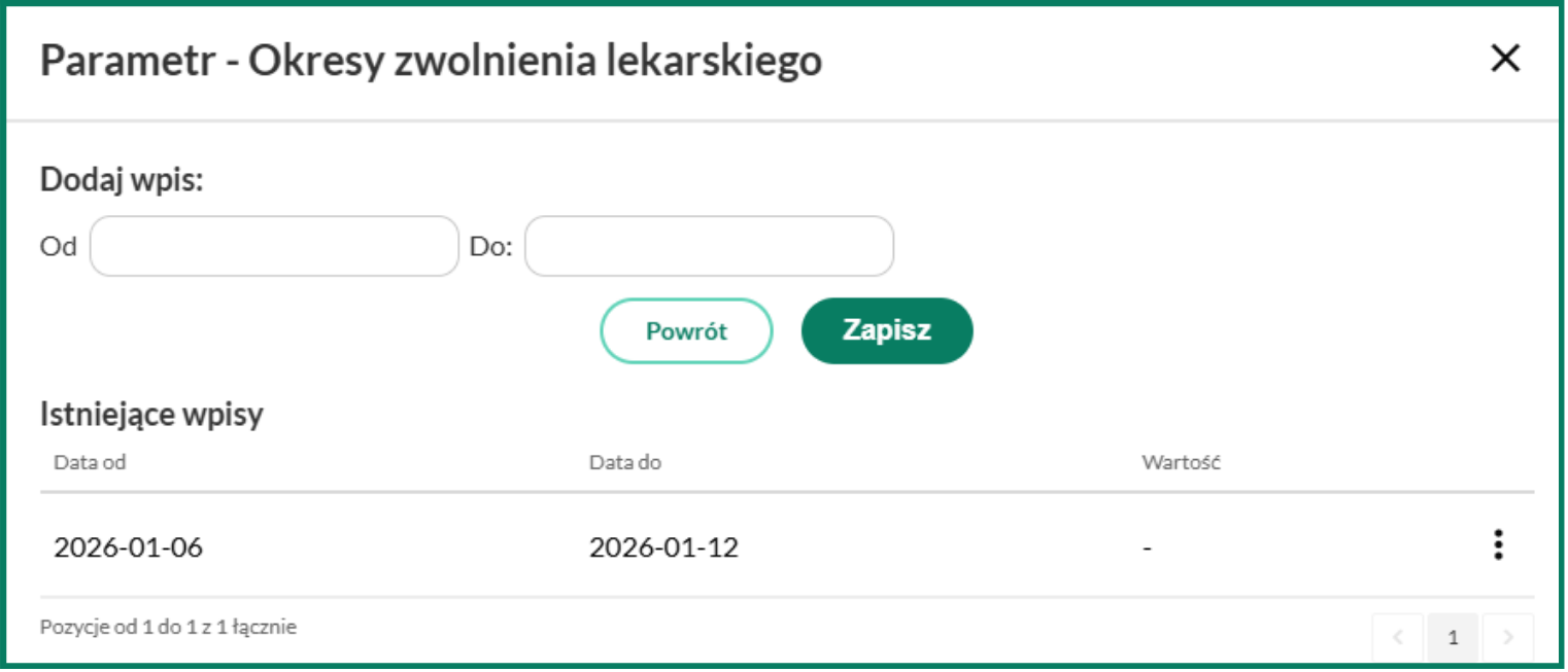 W tym celu należy na poziomie parametru Okresy zwolnienia lekarskiego wybrać Zmień i wprowadzić okres w którym klient przebywał na zwolnieniu i zatwierdzić dane przyciskiem Zapisz.
