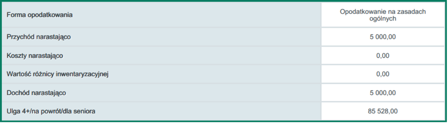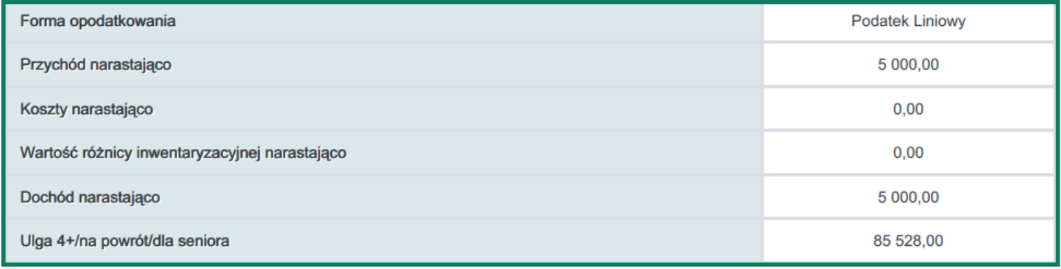 Po zaznaczeniu checkboxa, w rozliczeniu podatku dochodowego zostanie uwzględniona ulga w wysokości 85 528 zł.