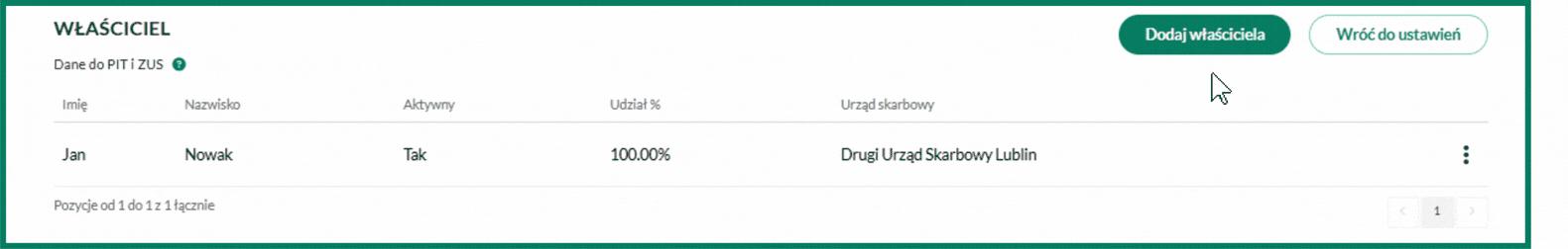 Wprowadzony wspólnik będzie widoczny na liście w zakładce Ustawienia/Właściciel.