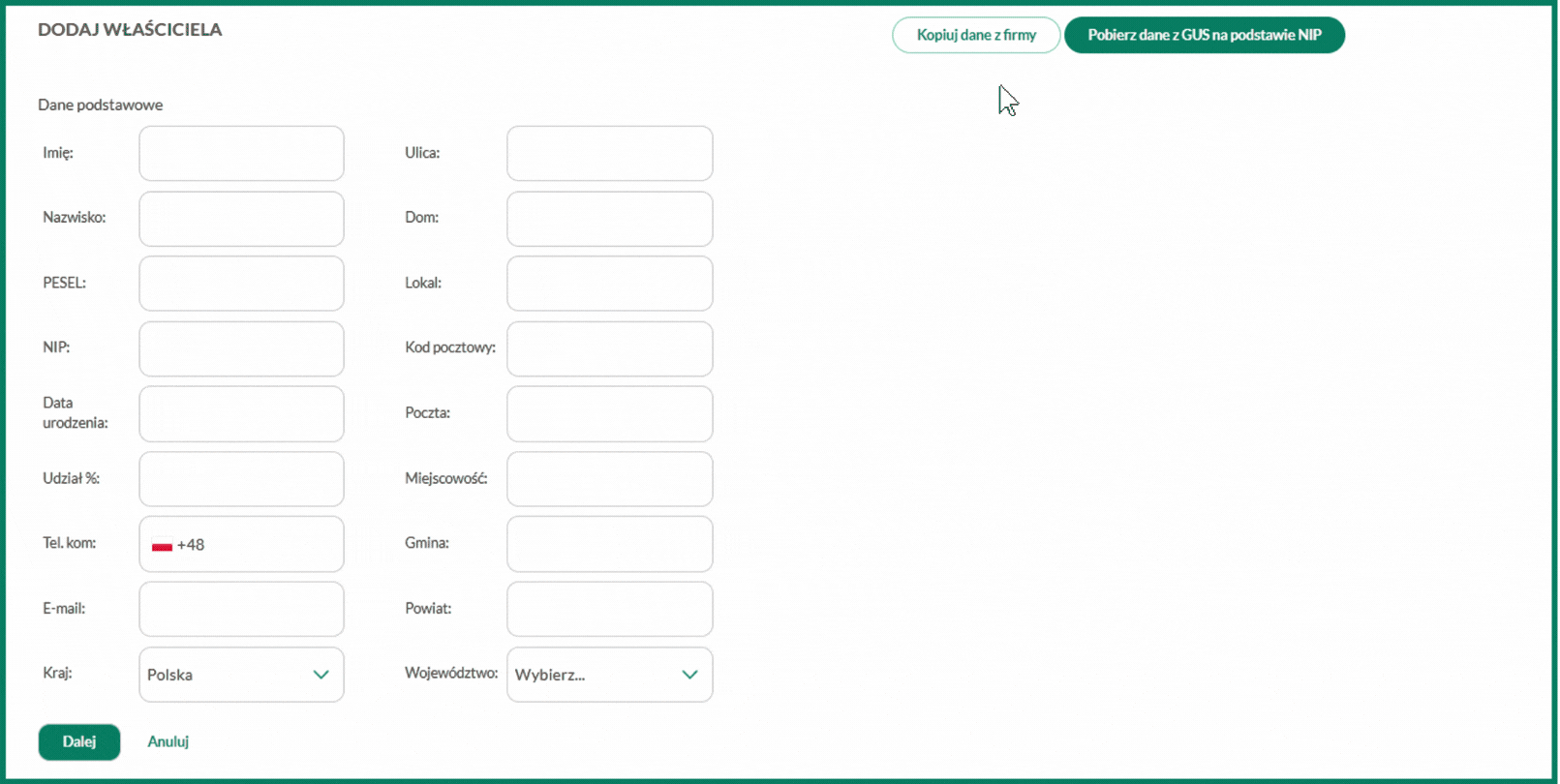 Wyświetli się wówczas formularz, który należy uzupełnić o wymagane dane. Wybierając przycisk Kopiuj dane z firmy zostaną zaciągnięte dane z zakładki Ustawienia/Firma.