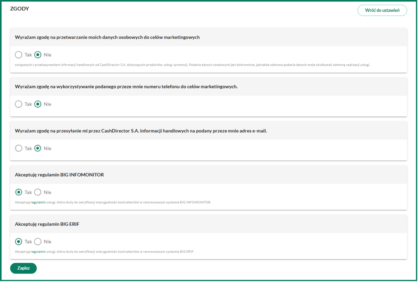Użytkownik w każdej chwili może wyrazić lub odwołać zgodę na komunikację marketingową. Zgody dotyczą indywidualnie przygotowywanych ofert, przesyłania informacji handlowych, wykorzystywania numeru telefonu do celów marketingu bezpośredniego. W celu dokonania zmian należy przejść do Ustawienia/Zgody.
