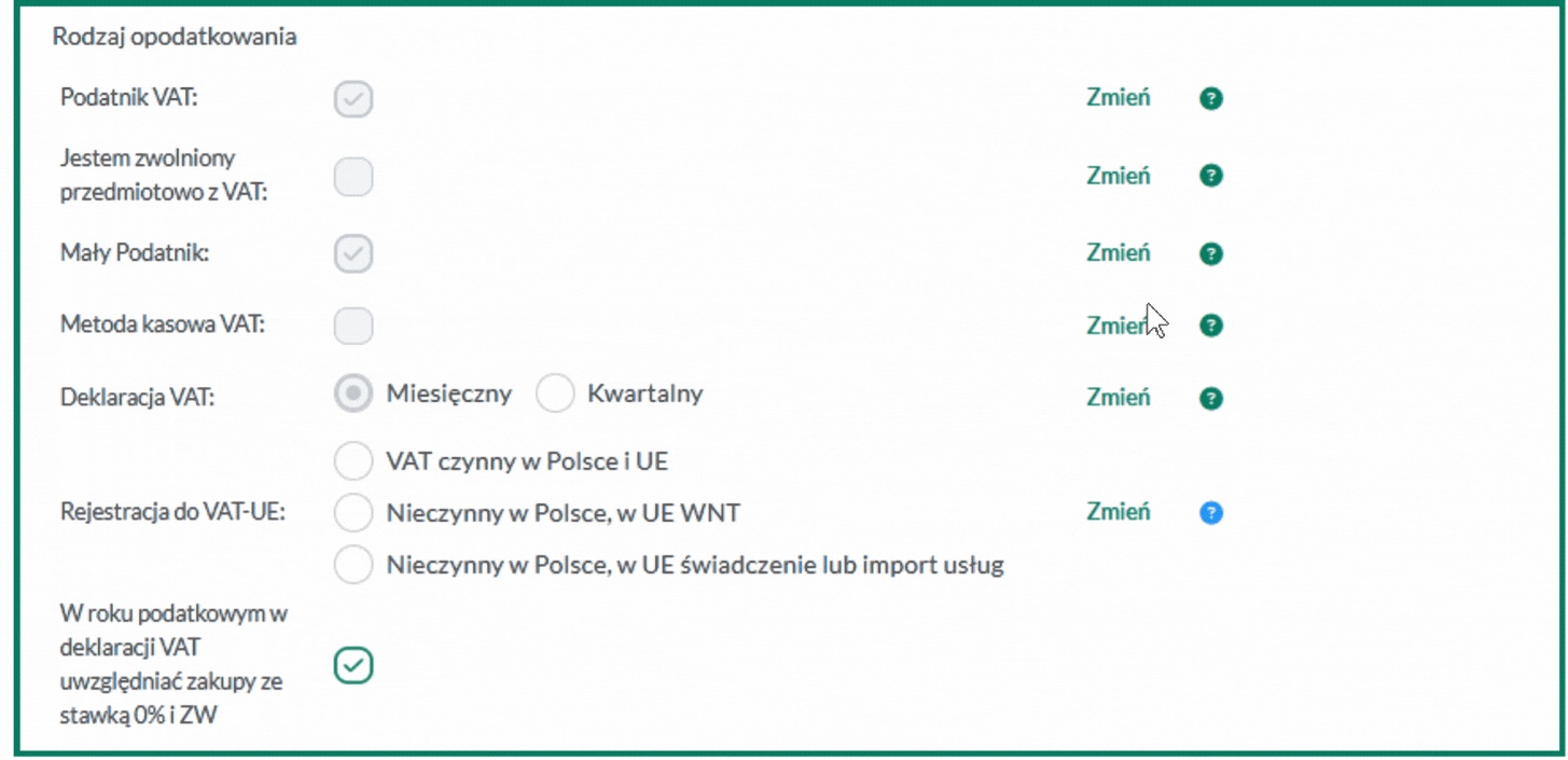 Statusu małego podatnika, u którego wartość sprzedaży (wraz z kwotą podatku) nie przekroczyła w poprzednim roku podatkowym wyrażonej w złotych kwoty odpowiadającej równowartości 2 000 000 euro (dotyczy większości podatników rozliczających się za pomocą KPiR) można wprowadzić w ustawieniach firmowych. W tym celu przy parametrze Mały Podatnik należy wybrać Zmień i w otworzonym oknie uzupełnić właściwe daty: