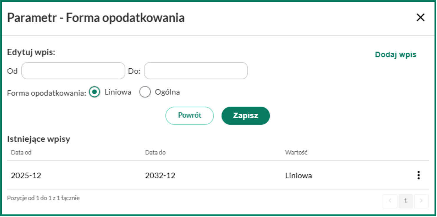 Podatek liniowy jest jedną z form opodatkowania do wyboru. Charakteryzuje się stałą stawką podatku (19%) od dochodu. W celu jej zaznaczenia należy przejść do zakładki Ustawienia/Właściciel, wybrać przycisk Zmień, w otworzonym oknie zaznaczyć formę opodatkowania Liniowa i wpisać właściwy zakres dat: