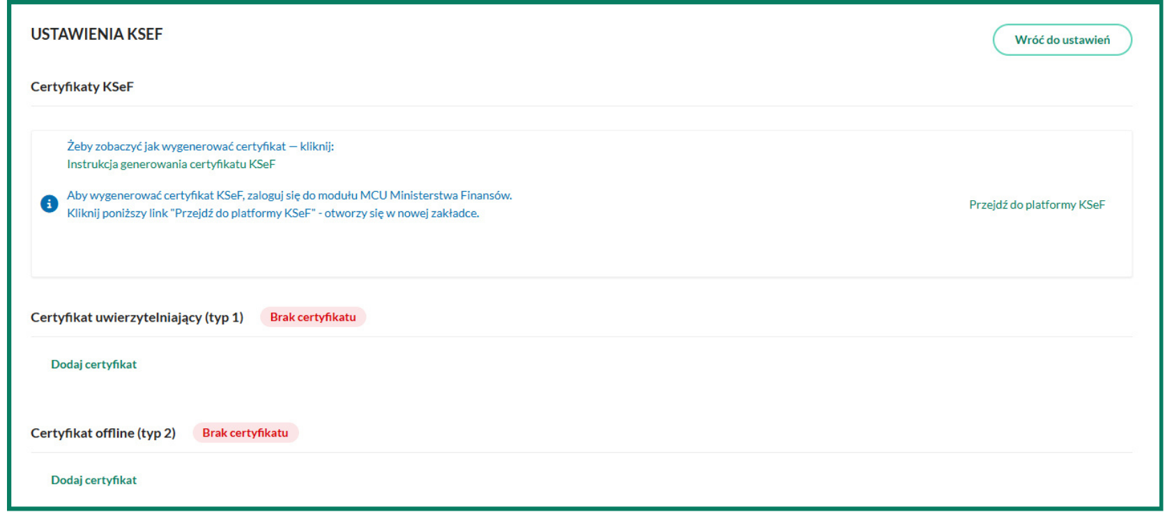W sekcji Certyfikaty możliwe jest zarządzanie certyfikatami wykorzystywanymi w KSeF.