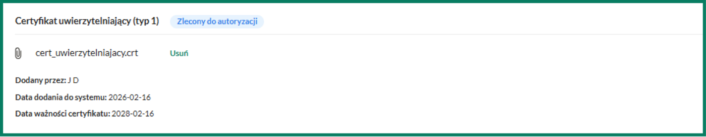 Każdy dodany certyfikat (uwierzytelniający oraz offline) może zostać usunięty.