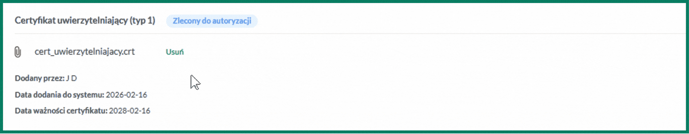 Po poprawnym dodaniu certyfikatu system zapisuje certyfikat w systemie oraz aktualizuje jego status.