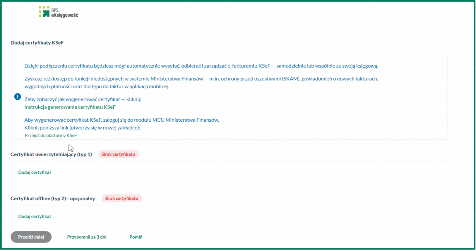 Dzięki temu możesz uzupełnić brakujący certyfikat bez konieczności opuszczania aktualnego procesu, a po jego poprawnym dodaniu kontynuować rozpoczętą akcję (pobieranie lub wysyłkę dokumentów do KSeF).