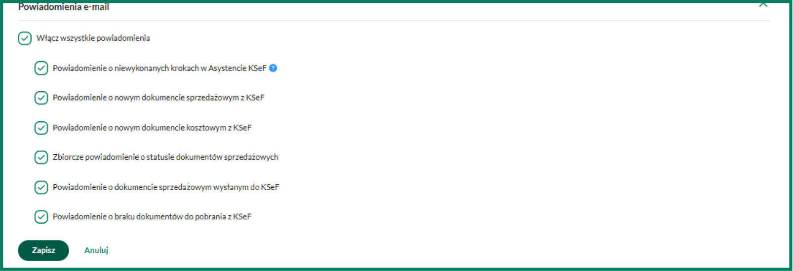 Odznaczenie checkboxa powoduje, że powiadomienie danego typu nie będzie wysyłane.