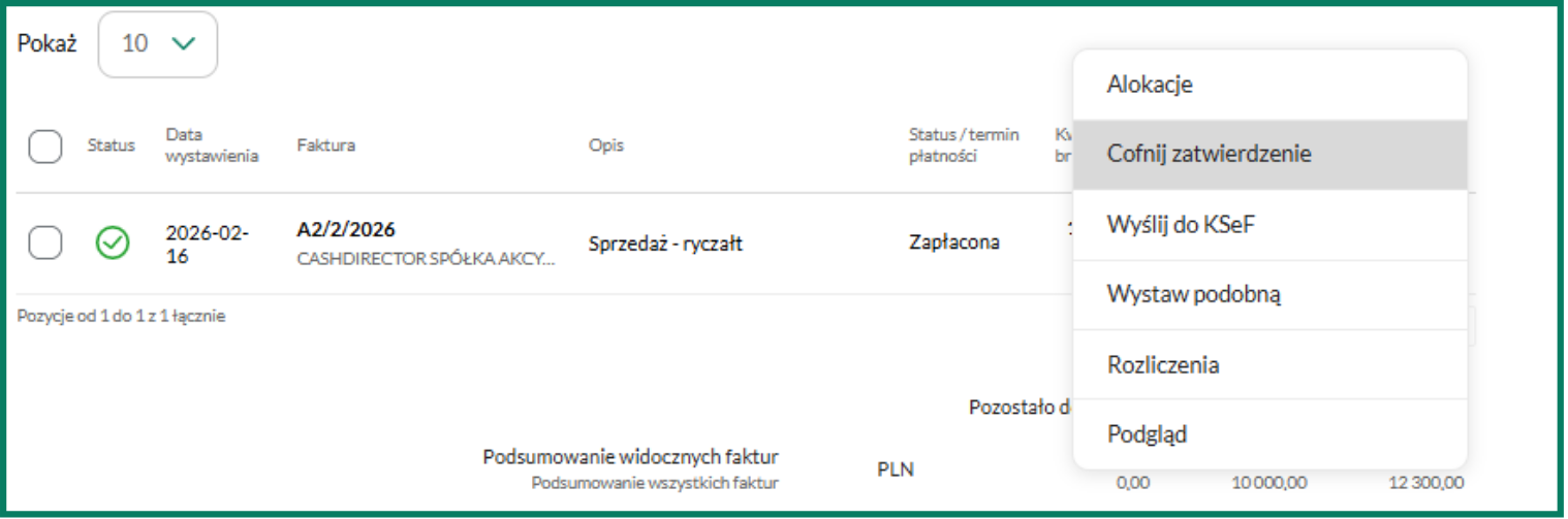 Aby zmienić dane wprowadzone na fakturze, najedź kursorem myszy na trzy kropki z prawej strony na panel dokumentu i wybierz opcję Cofnij zatwierdzenie.