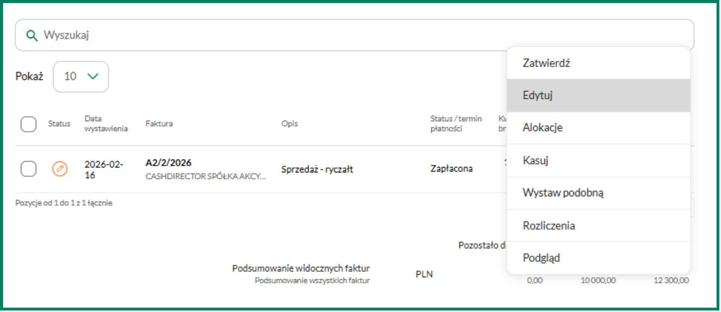 Po odksięgowaniu faktury wybierz przycisk Edytuj:
