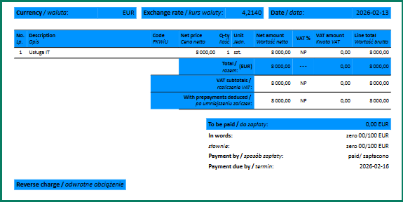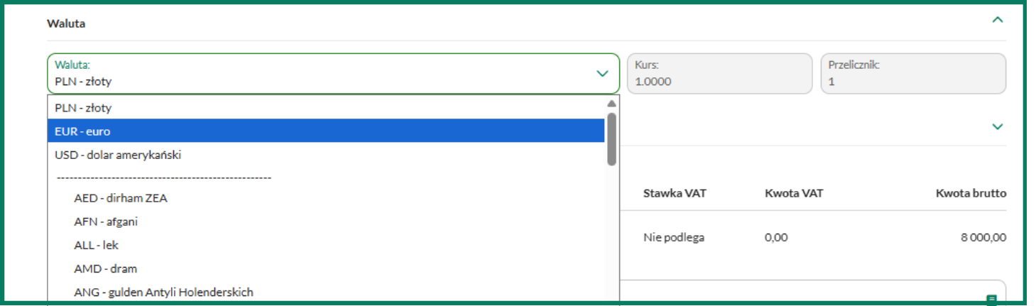 Po wybraniu waluty System wyświetli datę publikacji kursu, kurs oraz przelicznik, a wartość faktury zostanie automatycznie przeliczona.