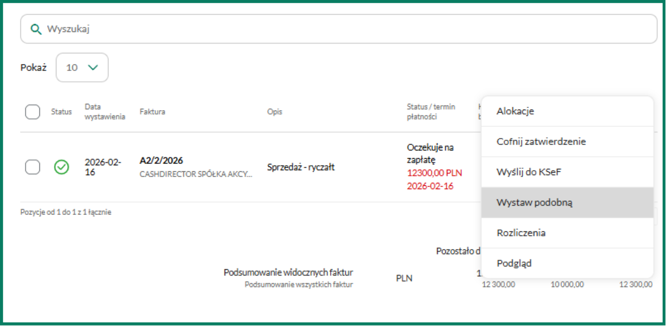 Comiesięczne wystawianie faktury dla tego samego kontrahenta możesz usprawnić, korzystając z funkcji Wystaw podobną. Przycisk ten pojawi się, gdy skierujesz kursorem myszy na trzy kropki z prawej strony na linii wcześniej wystawionej faktury w zakładce Fakturowanie/Faktury.