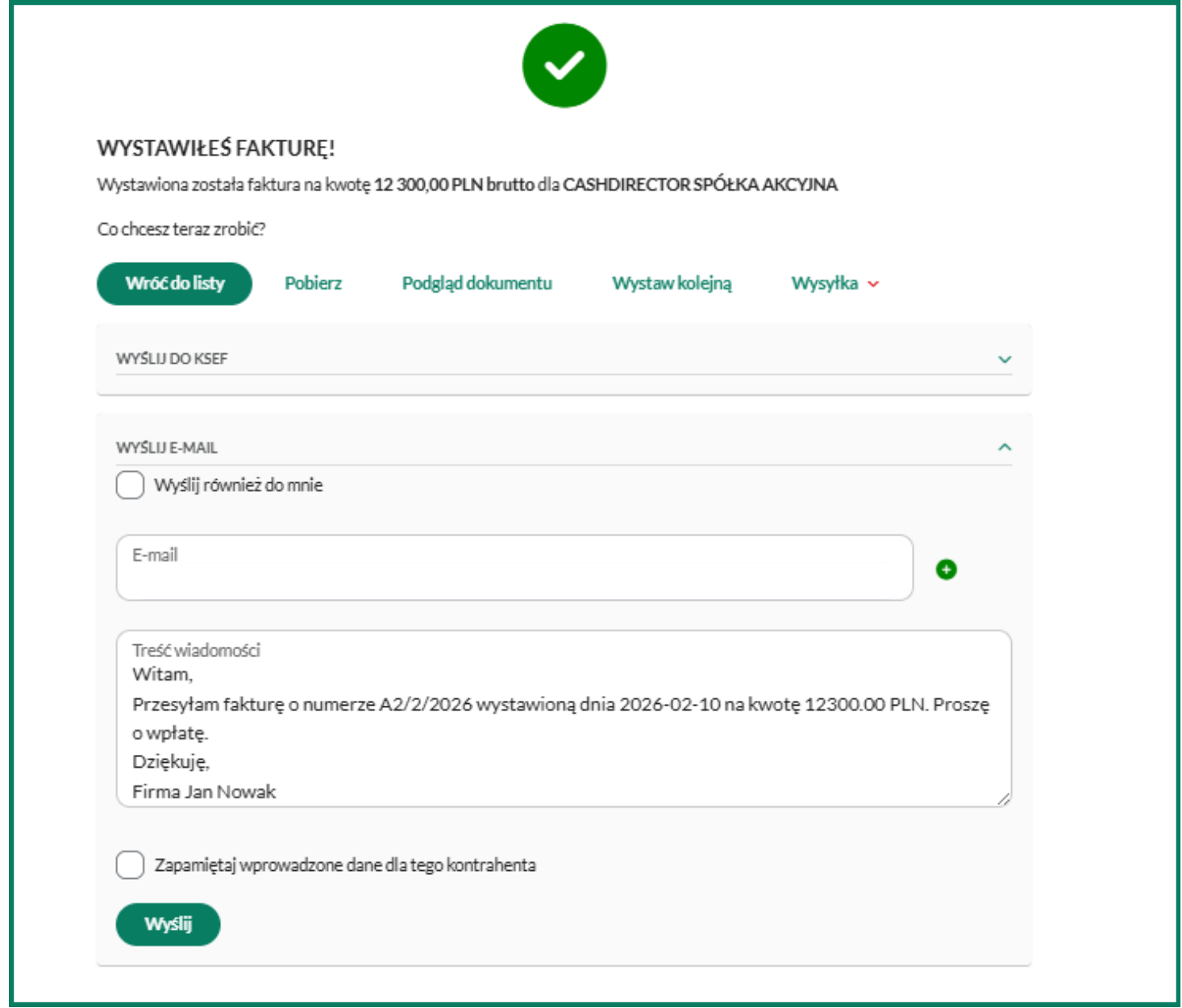 Fakturę sprzedaży możesz wysłać do kontrahenta od razu po jej wystawieniu z poziomu okna sukcesu. W celu wysyłki wprowadź adres e-mail kontrahenta oraz wybierz przycisk Wyślij. Zaznaczając opcję Wyślij również do mnie wyślesz fakturę również na swój adres e-mail.