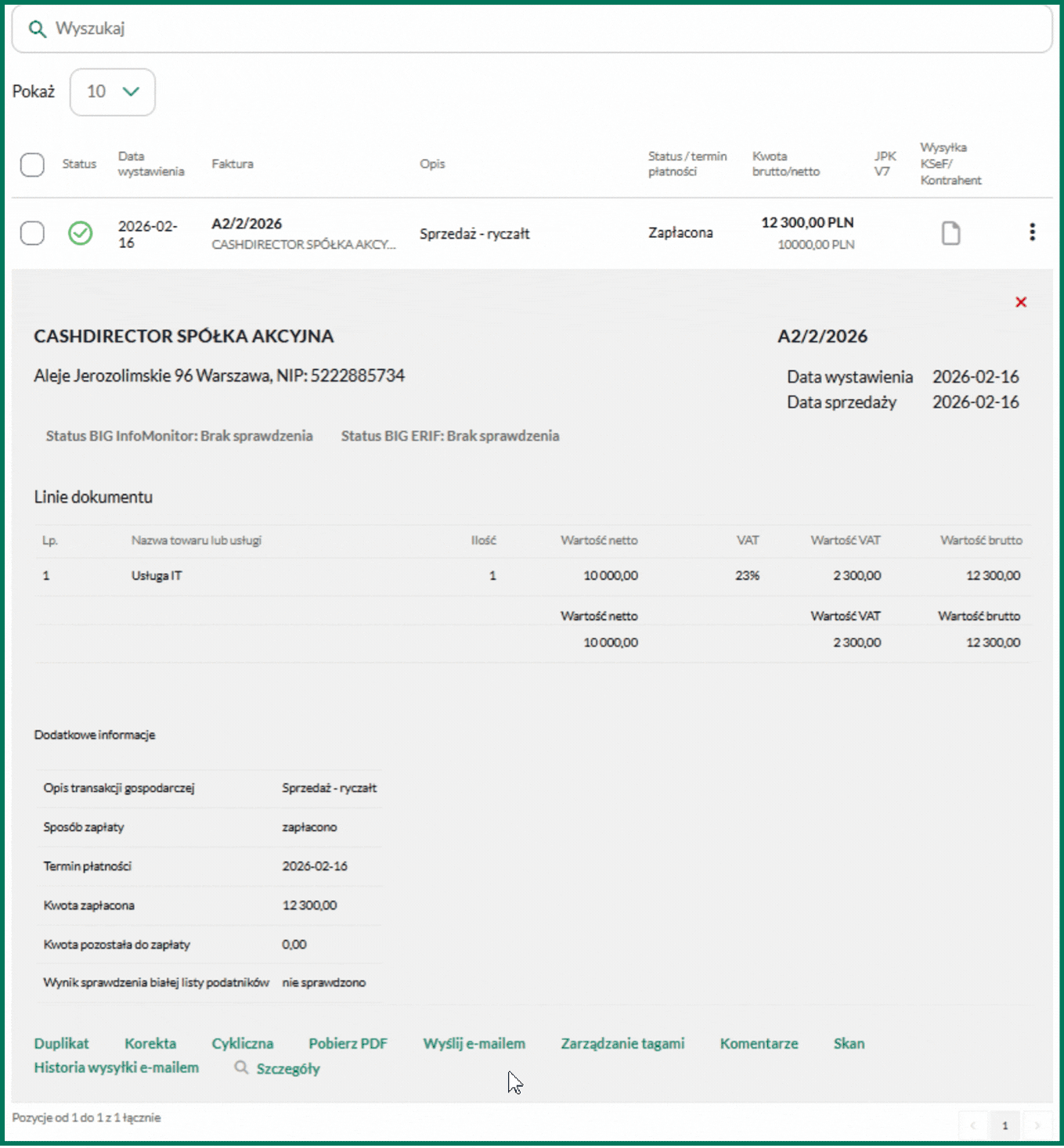 Po kliknięciu w fakturę i rozwinięciu dokumentu pojawia się opcja Wyślij e-mailem.
