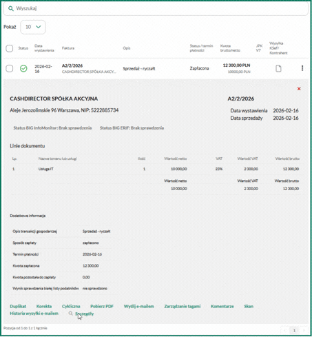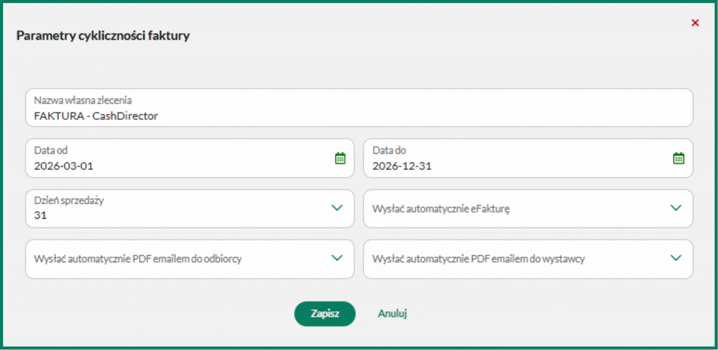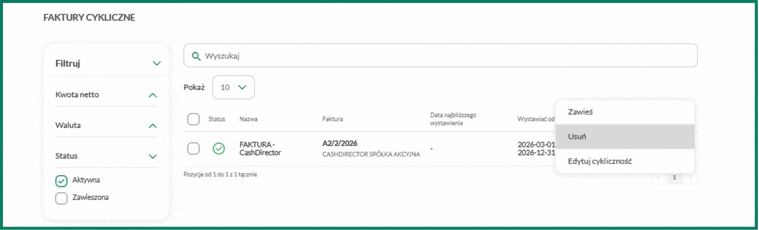 System pozwala automatycznie generować faktury wystawiane cyklicznie – np. co miesiąc. Każda nowa faktura jest tworzona na podstawie dokumentu pierwotnego, z aktualnymi datami. Jeśli faktura jest walutowa, System uwzględni także właściwy kurs waluty z dnia wystawienia.
