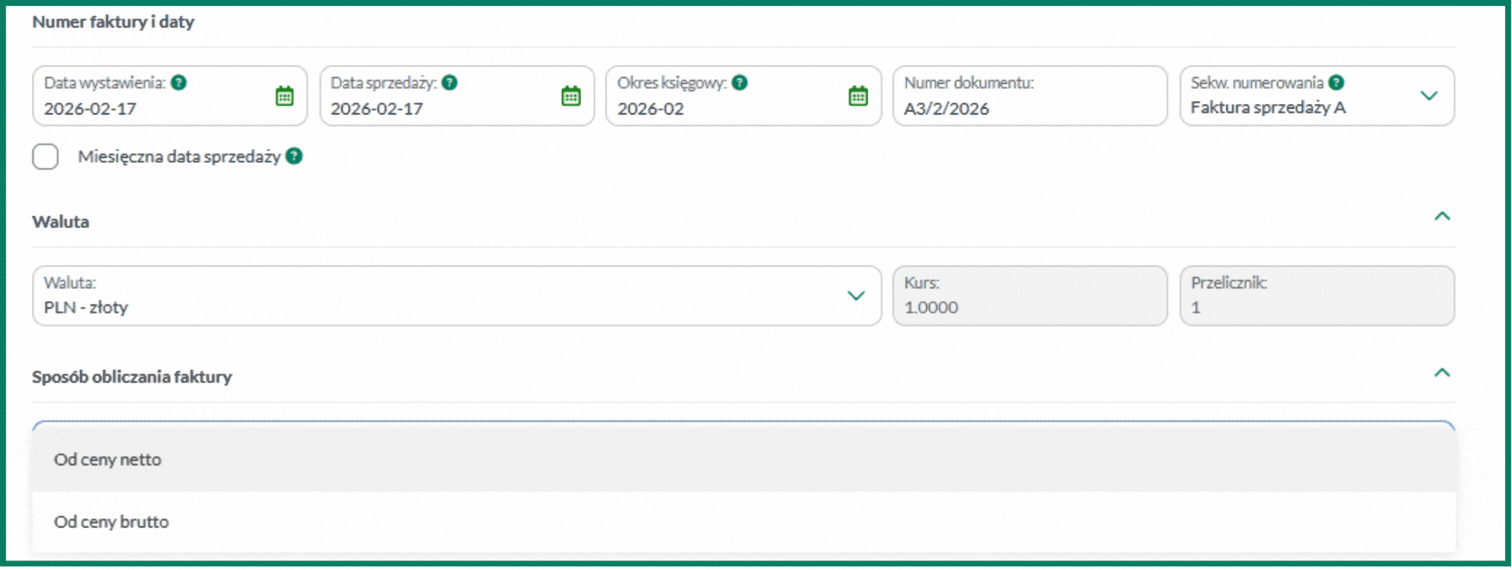 Podczas wystawiania faktury możesz zdecydować, od jakiej kwoty system ma obliczyć wartości dokumentu.