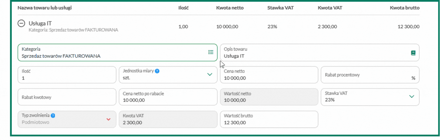 Aby dodać kod PKWiU do faktury, rozwiń Pozycję na szablonie faktury, a następnie w polu Kategoria kliknij zieloną ikonę.