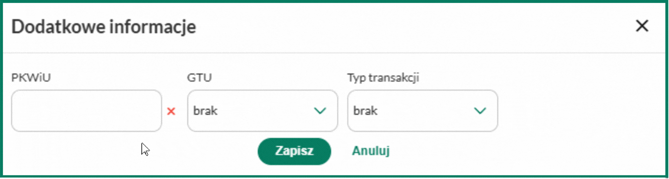 Po kliknięciu ikony wyświetli się okno, gdzie będziesz mógł wprowadzić kod PKWiU.