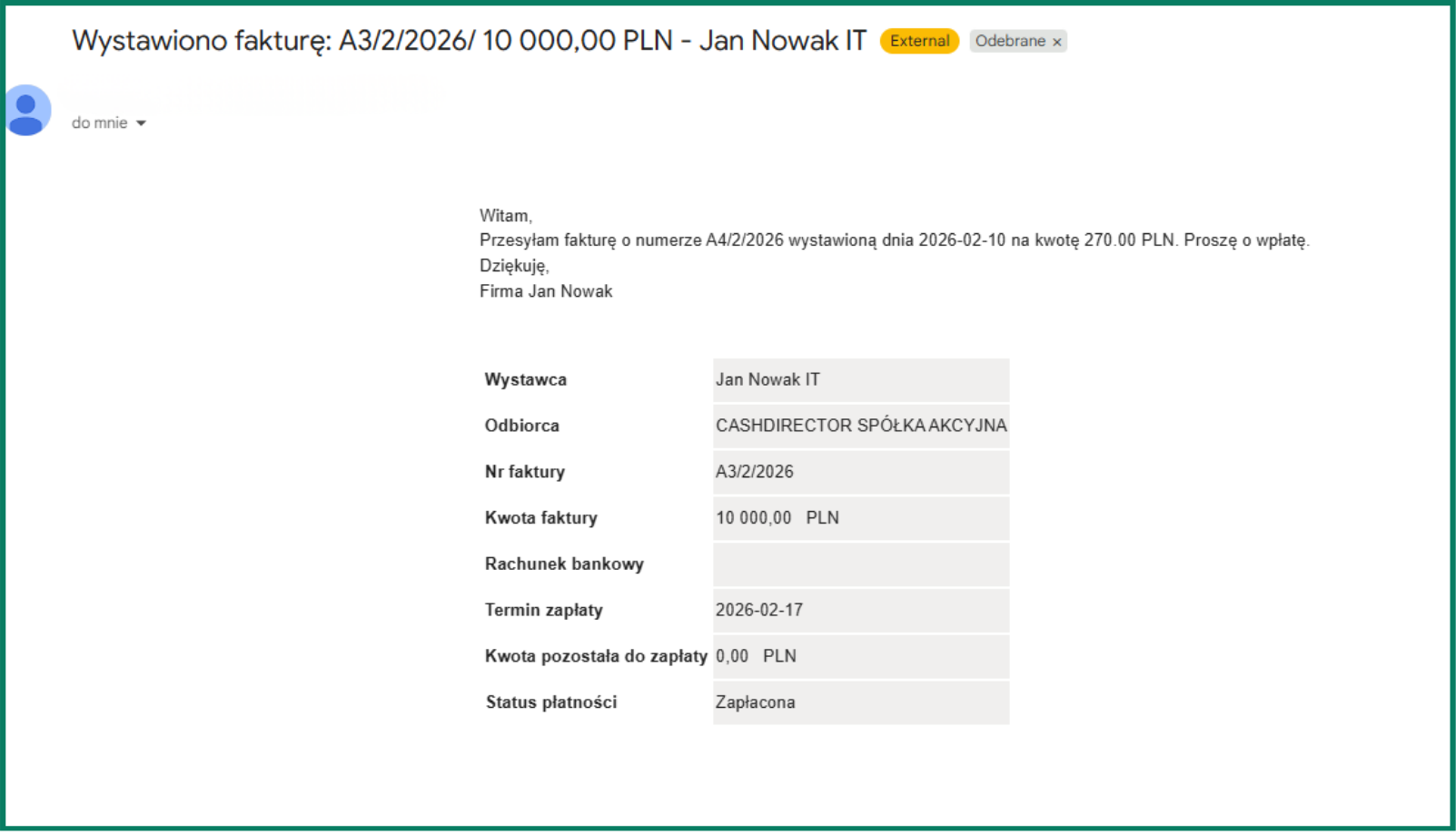 Wiadomości e-mail zawierające wystawioną fakturę w Systemie uwzględniają poniższe informacje: