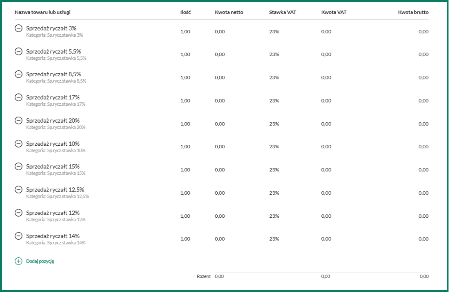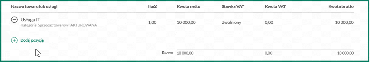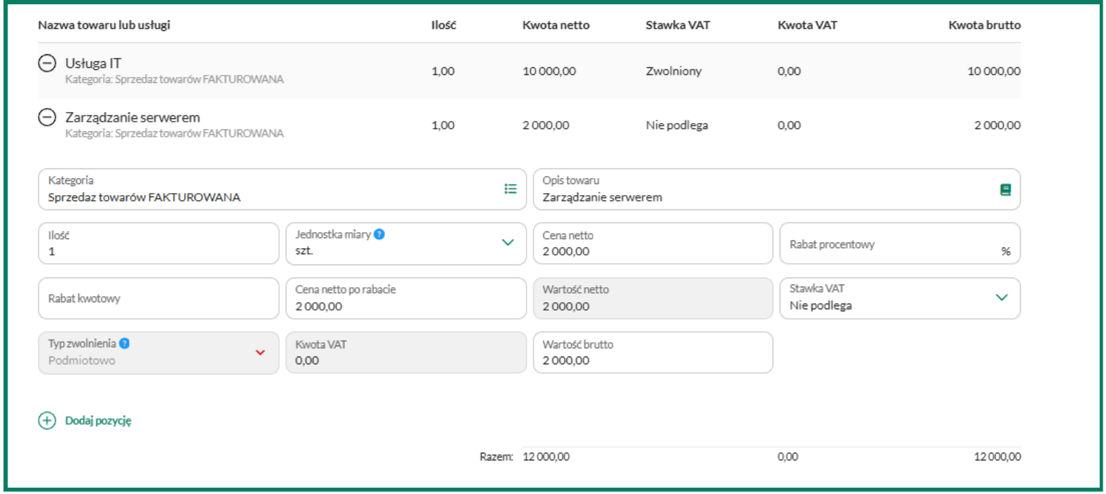 Po uzupełnieniu wszystkich danych w pierwszej pozycji kliknij przycisk Dodaj pozycję, aby dodać kolejną.