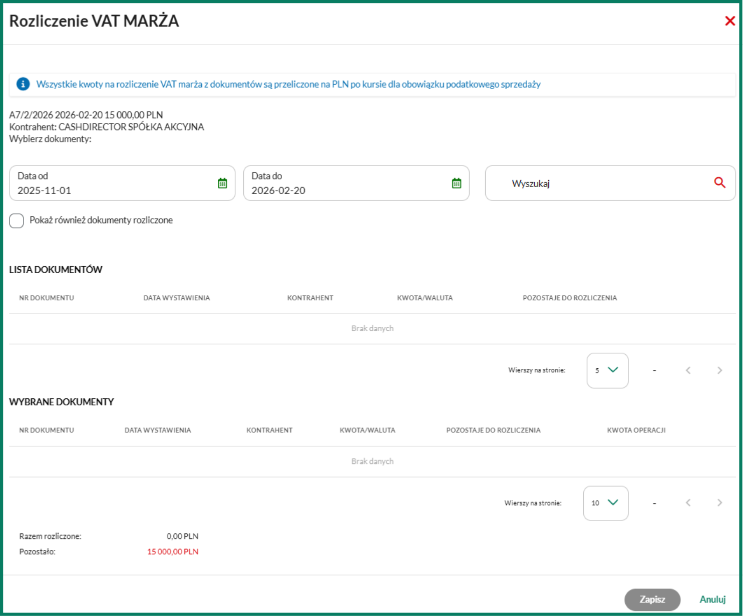 W celu prawidłowego zaksięgowania dokumentu, tj. wykazania dla niego wszystkich faktur kosztowych, które zostaną rozliczone oraz uwzględnienie prawidłowych wartości w pliku JPK, skieruj kursor na wystawioną fakturę i wybierz opcję Rozliczenia VAT marża. W wyświetlonym oknie zostaną zawarte informacje na temat faktury wraz z możliwością jej rozliczenia: