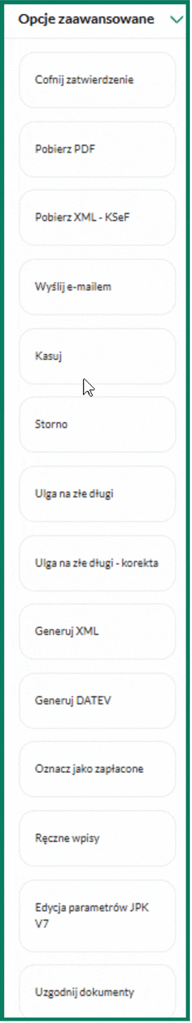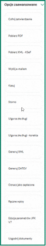 W przypadku konieczności usunięcia wpisu, zaznacz fakturę checkboxem i z Opcji zaawansowanych wybierz Kasuj: