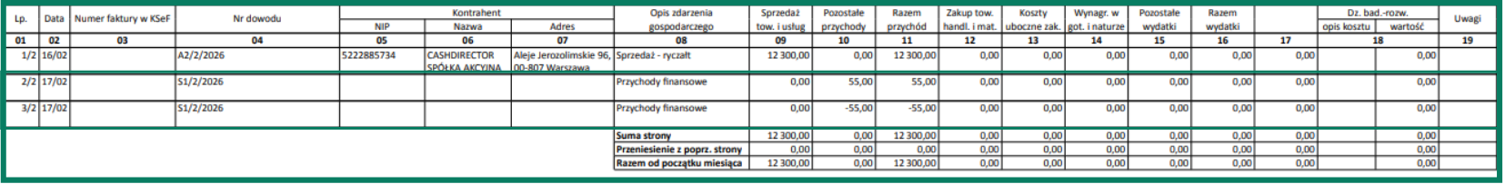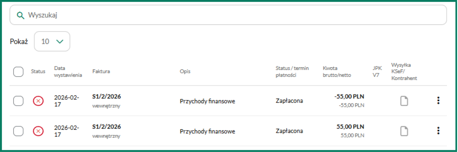 Zaznaczony dokument zostanie wyksięgowany - spowoduje to wygenerowanie nowego wpisu z wartością ujemną: