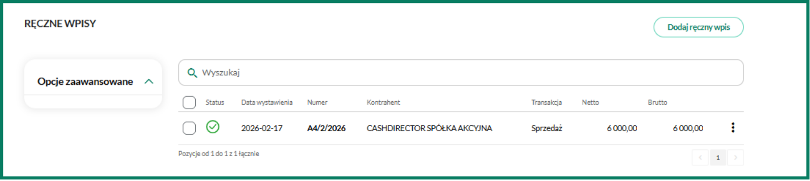 2. Kliknij Ręczne wpisy – będziesz mógł dodać nową pozycję, klikając przycisk Dodaj ręczny wpis, albo otworzyć listę istniejących wpisów i wprowadzić w nich zmiany.
