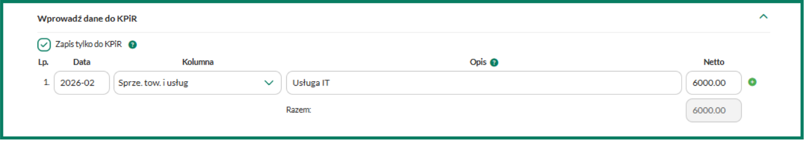 Jeśli chcesz, aby dokument pojawił się tylko w KPiR – bez ujęcia w deklaracji VAT – zaznacz pole zapis tylko do KPiR.