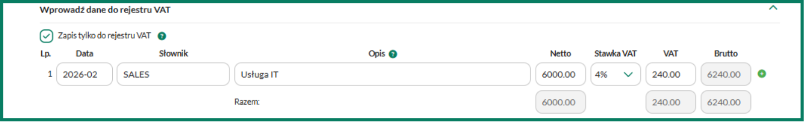 5. Jeśli zamiast tego zaznaczysz pole zapis tylko do rejestru VAT, kwota zostanie ujęta wyłącznie w rejestrze i deklaracji VAT – bez wprowadzenia do KPiR.
