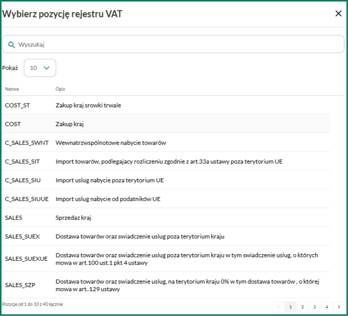 Wyświetli się okno Wybierz pozycje rejestru VAT, w którym możesz wskazać pozycję odpowiadającą właściwym polom rejestru lub deklaracji VAT.